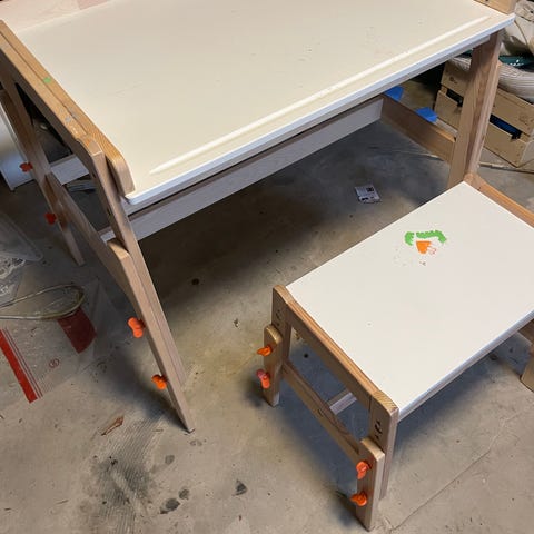 IKEA børnemøbel bestående af en hvid ramme med integreret spejl, bordplade og skammel. Møblet er designet til børn og kan anvendes til forskellige formål som leg, opbevaring og personlig pleje.