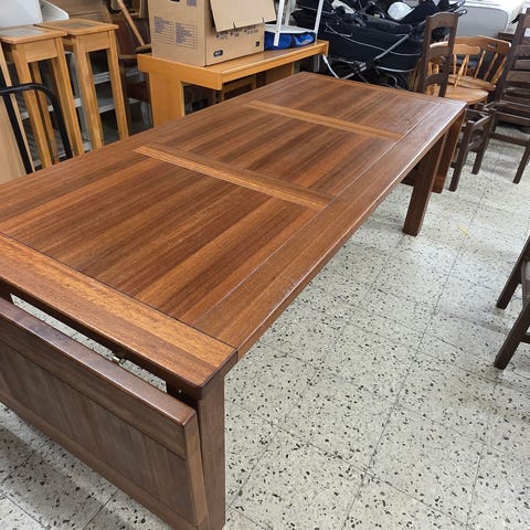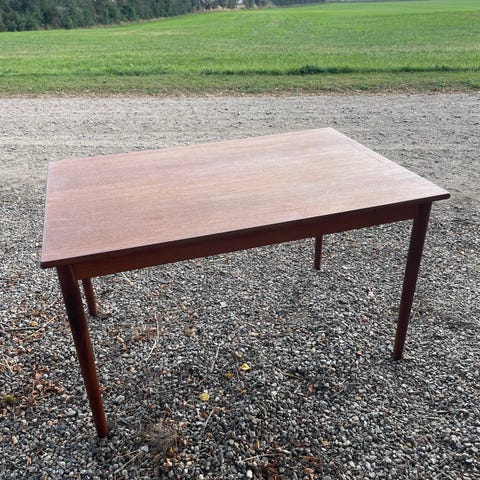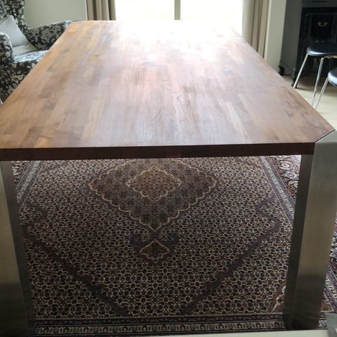 Teak træs bord, Stort spisebord flot plade med sort lakeret stålben 156x78 cm og 72 cm høj. Rugtig pænt.