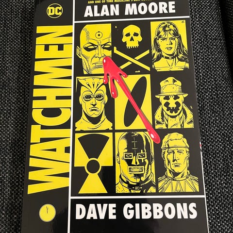 Watchmen tegneserie plakat med gul og sort farvetema. Motiv med hovedpersoner fra Watchmen-serien, illustreret i firkantede felter. Plakaten har et grafisk udtryk med røde visere som et ur.