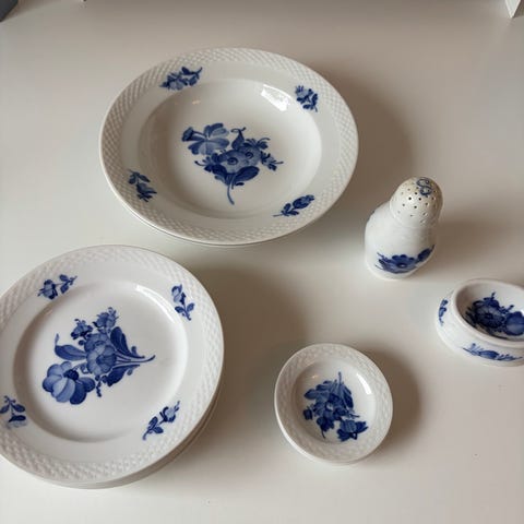 Royal Copenhagen Stel service med blå blomsterdekor. Servicedelene består af tallerkener, skåle, kopper og fade i porcelæn med klassisk blå blomstermønster. Velegnet til daglig brug eller til servering ved særlige lejligheder.