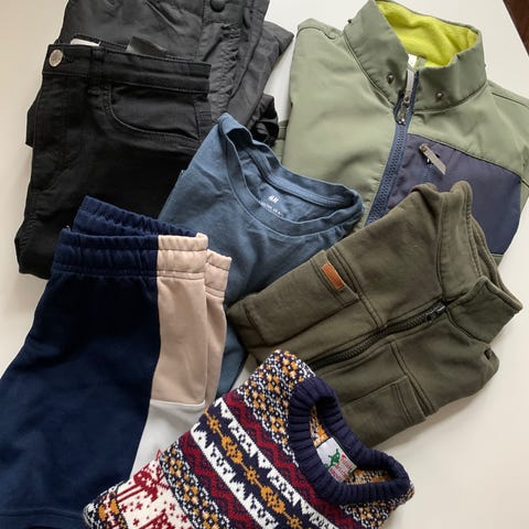Multifarvet børnetøj i størrelse 164 til drenge. Sættet indeholder forskellige stykker tøj, herunder t-shirts, hættetrøjer og bukser i forskellige farver og design.
