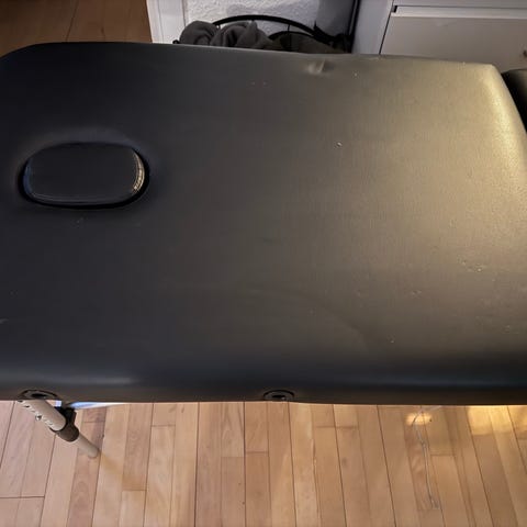Massagebriks / bænk i beige farve med tilhørende taske til opbevaring og transport. Bænken har polstrede overflader og justerbare dele. Kan justeres manuelt i højden. Der medfølger nakke/hovedstøtte samt armstøtter.