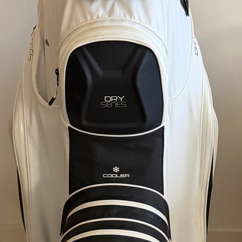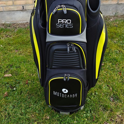 Motocaddy Pro Series golfbag i sort og rød farve. Tasken har flere rum og lommer til opbevaring, inklusive et stort rum til golfkøller. Designet til golfspillere, der har brug for organiseret og praktisk opbevaring under spil.