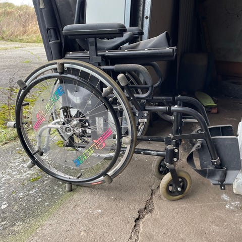 Standard manuel kørestol med sort stel og sæde. Kørestolen har store baghjul til manuel fremdrift og små forhjul for bedre manøvredygtighed. Den har fodstøtter og armlæn for støtte og komfort. Designet til at give mobilitet til brugere med nedsat gangfunktion.