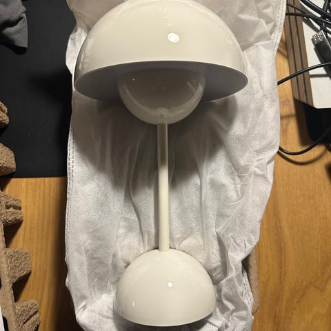 Højglans hvid Flowerpot VP9, Verner Panton fra &Tradtion. Den ser beige ud på billederne, men er altså hvid i virkeligheden. Opladerkabel medfølger.