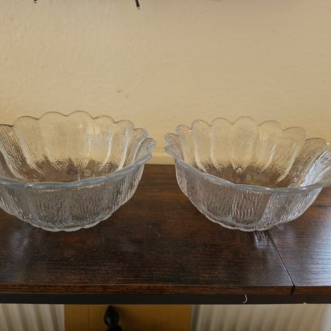 Holmegaard skåle fremstillet i glas med bølget kantdesign. Skålene har en gennemsigtig struktur med tekstureret glas, der giver et dekorativt udtryk.
