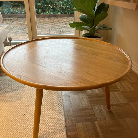 Sofabordet er massiv eg og kan slibes. Der er nogle brugsmærker på, men det kan slibes væk,