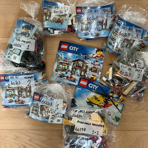 Blandet LEGO legetøj bestående af forskellige byggeelementer og figurer. Blander fra mange set, det meste LEGO friends. indeholder flere tema-relaterede dele, f eks sygehus og forlystelsespark. der kan kombineres til forskellige scenarier og aktiviteter.