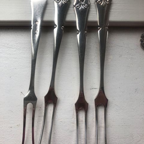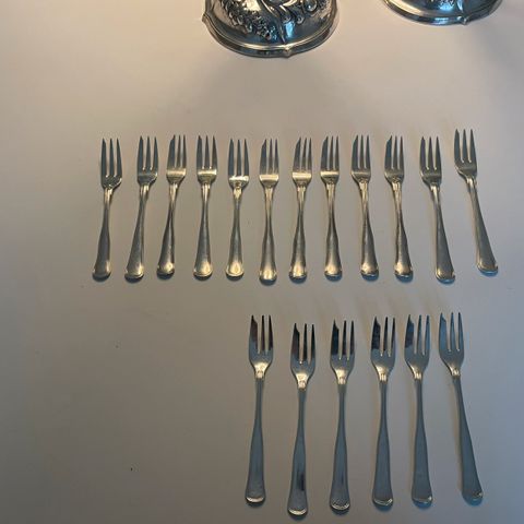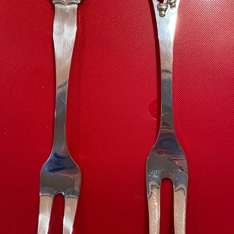 I god, brugt stand med diskrete initialer graveret på bagsiden; Den ene gaffel er blevet testet for sølv og derfor lidt ridset.