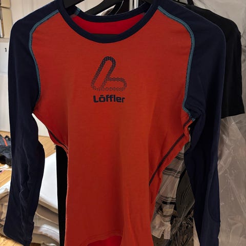 Ægte vintage Löffler herretrøje i størrelse 52, designet til sport og fritid. Trøjen er primært rød med grå og hvide detaljer på ærmer og skuldre. Materialet er funktionelt og egnet til sportstype Andet.