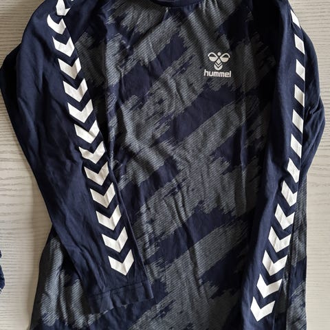 Bluse med lange ærmer, er mørkeblå og grå mønstret, og med blå ærmer med hvide Hummel striber og Hummel Logo på forstykket.