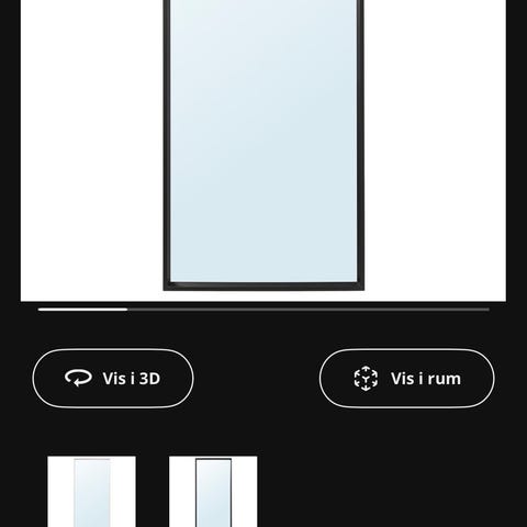IKEA spejl med sort ramme. Spejlet har en rektangulær form og en enkel, moderne stil. Det kan bruges til at skabe mere lys og rumfornemmelse i forskellige rum, såsom soveværelse, entré eller stue.