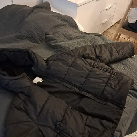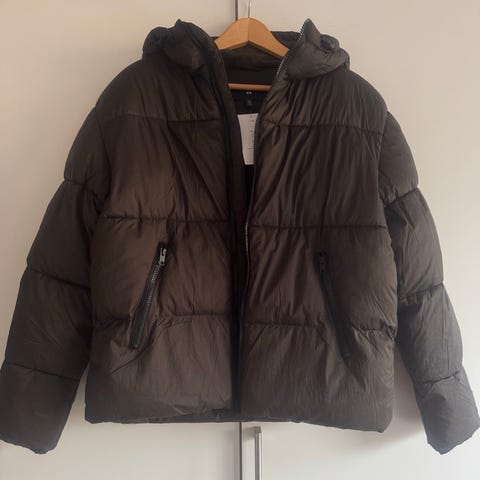H&M frakke i taupe farve, størrelse S, fremstillet af polyester. Designet til kvinder. Virkelig var jakke, puffer jakke kun brugt 1 gang, Ingen brugs spor gode store lommer, dejlig hætte, små slidser i siden med tryk knapper