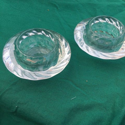 Et par kongeblå Amager / Twist Lysestager fra Kastrup Glasværk. Designet af Jacob E. Bang. 12.4 cm Høje. 7.6 cm diameter. I fin hel stand.