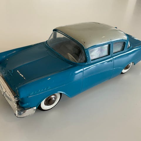 Opel Rekord - gammel modelbil, rød og hvid. I bunden står der "Sign of Quality - Made in Japan".