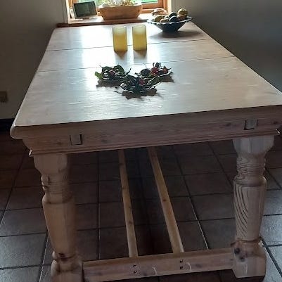 Massivt fyrretræs spisebord med to butterfly udtræksplader. Vejer ca. 100 kg - benene kan skrues af. Vores gamle hund har sat sine tænder i bordbenene. Se billede. Bredde: 100 cm Længde: 200 (292) cm (Tillægsplader 46 cm x 2)