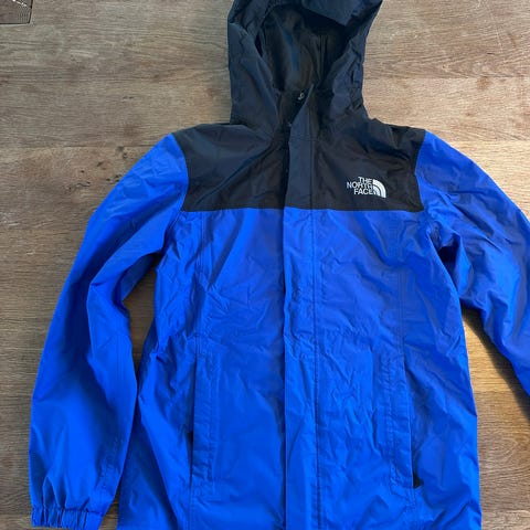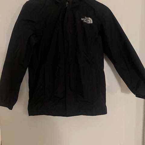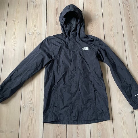 The North Face regnjakke i størrelse 170, sort. Kun anvendt én gang i efteråret. Er desværre blevet for lille. Lynlås og velcro lukning. To lommer. Åndbar regnjakke.
