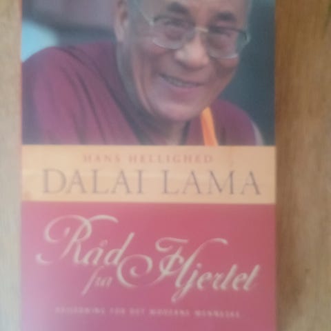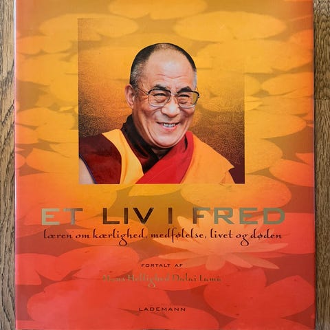 Bogen på billedet er "Et liv i fred", der handler om Dalai Lamas lære.