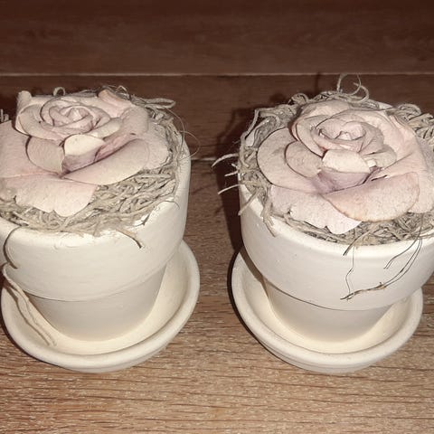 2 x 2 stk blomsterdekorationer i urtepotter af gips, kunstige roser i råhvid eller rosa i romantisk shabby chic stil, gode til værtindegave, lille sæt: 10 cm høj, stort sæt: 13 cm høj, kan sælges som samlet sæt til kr. 650 (billede 2)