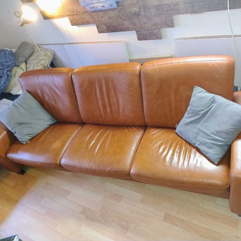 Velholdte sofaer i kraftigt okselæder uden siddemærker. Kommer fra ikke rygerhjem.
