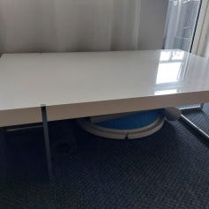 Sofabordssæt i 60x120 og 48x85 med hvide bordplader og træben i asymmetrisk design. Brugte men i god stand. Sælges samlet til 150 kr.