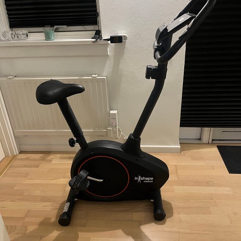 inShape motionscykel med sæde, udstyret med digitalt display med Bluetooth-funktion. Cyklen har pedaler med remme og justerbart sæde. Velegnet til indendørs træning og konditionstræning.