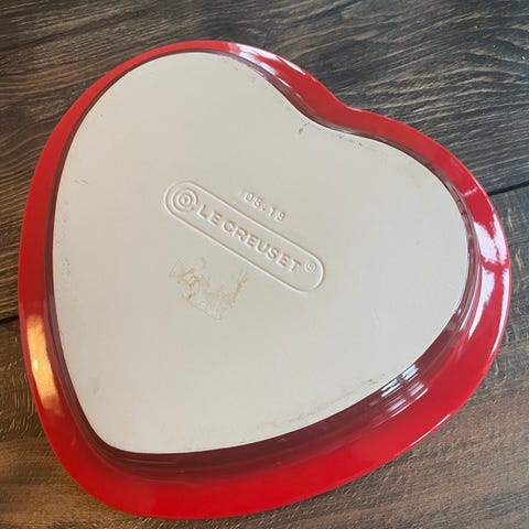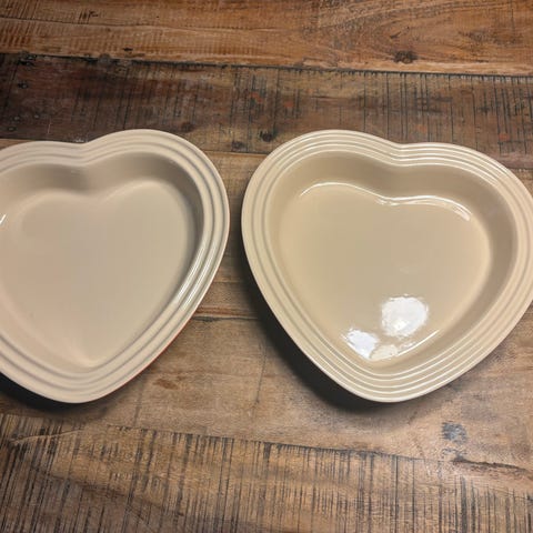 Le Creuset hjerteformet fad i sjælden hvid farve. Brugt en enkelt gang til servering af salat (dvs. ikke kommet i ovn). Mål fremgår af sidste billeder.