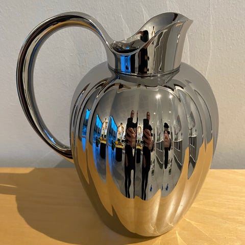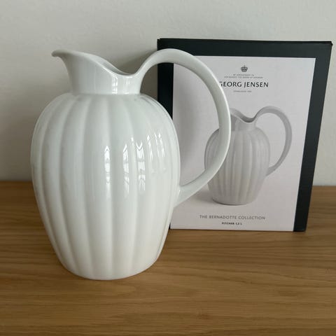 Georg Jensen Bernadotte kande i hvid porcelæn. Kanden har et klassisk design med riller og et håndtag, der sikrer nem håndtering. Velegnet til servering af varme og kolde drikke. 50 cl vejledende pris 350,-