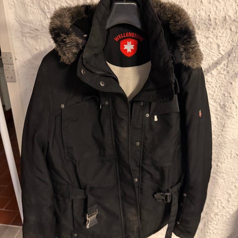 Wellensteyn dame vinterjakke i sort og rød med hætte. Jakken har lynlåslommer og en pelsbeklædt hætte. Den er designet til kvinder og egnet til koldere vejrforhold.