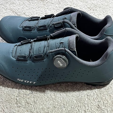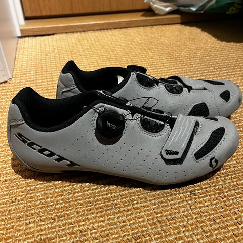 Scott cykelsko i størrelse 43, hvide. Skoene har en lukning med snøresystem og velcrostrop for justerbar pasform. Designet til cykling med stive såler og klikpedalsystem. Materialet er syntetisk med perforeringer for ventilation.