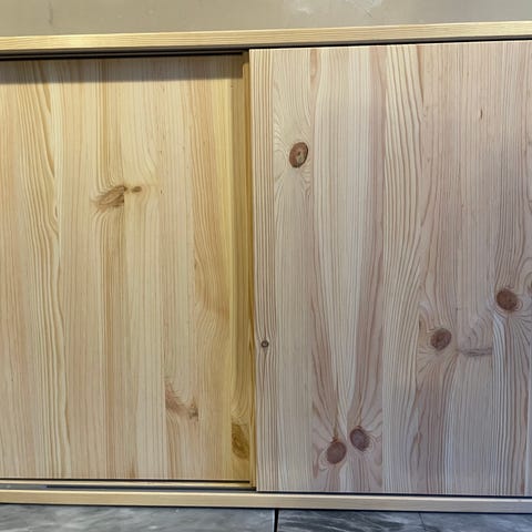 Lavet ud af Ikeas IVAR skab, malet i beige farvet og fire ikea sofaben påsat.