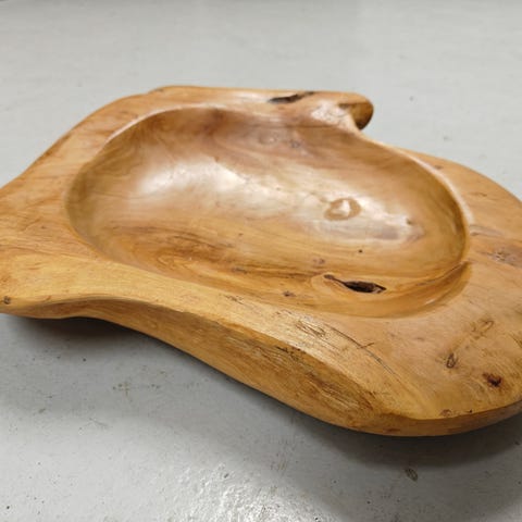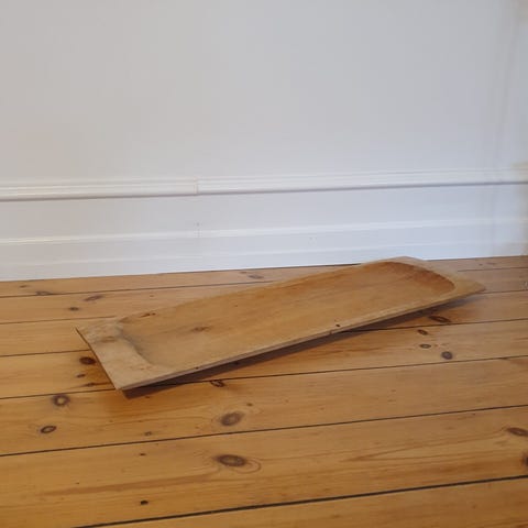 Træfad med en buet form og glat overflade. Fadet er lavet af træ og har en naturlig brun farve. Velegnet til servering eller som dekorativ genstand. Ægte retro fra ca 1960'erne. Fin stand. Måler 38 cm i længden og 15 cm i bredden. Kan hentes i Næstved eller sendes