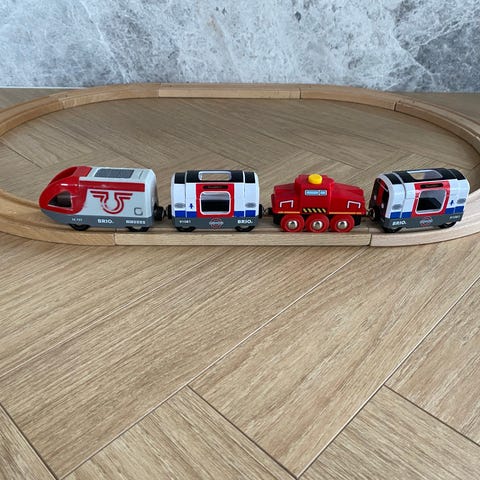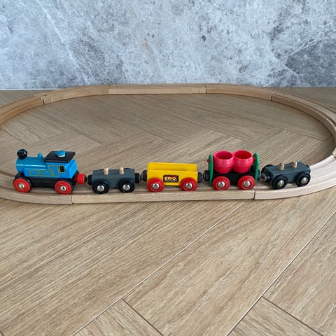 BRIO elektrisk lokomotiv, med batterier så det er klar til brug. trætog sæt med tilhørende træskinner. Sættet består af et lokomotiv og flere vogne i farverne gul, rød og grøn. Toget er designet til børn og kan bruges på det medfølgende træskinnebane, som kan sættes sammen i forskellige former.