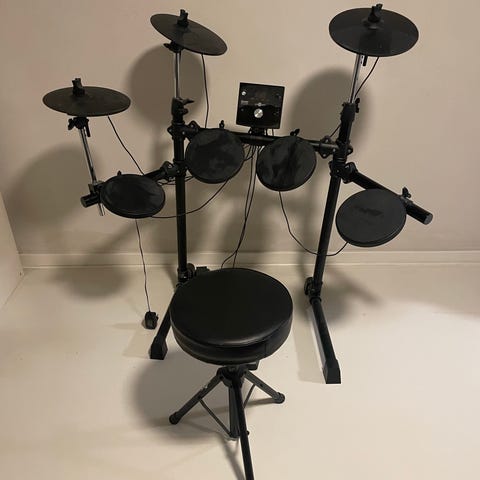 Gear4music D400+ Electronic Drum Kit med flere trommepuder og pedal. Trommesættet er designet til elektronisk trommespil og inkluderer en kontrolenhed med funktioner til mønstre, kits og lydstyrkejustering.