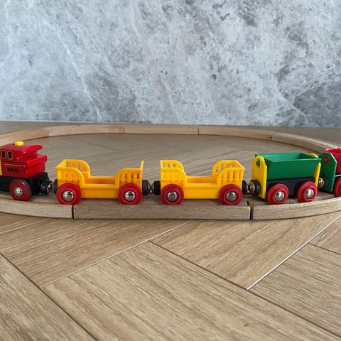 BRIO elektrisk lokomotiv med batterier , klar til leg. trætogssæt bestående af et lokomotiv og flere vogne i forskellige farver. Togsættet er lavet af træ og er designet til børn.