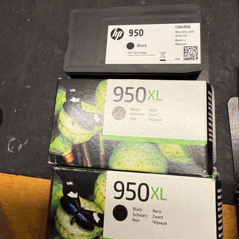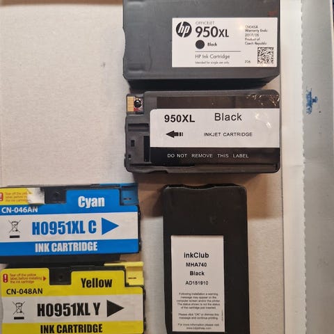 Da jeg har skiftet printer, sælges her originale, uåbnede HP-blækpatroner, model 950 (sort) og 951 (CMY = Cyan, Magenta, Yellow).
