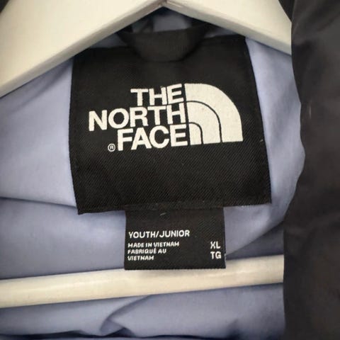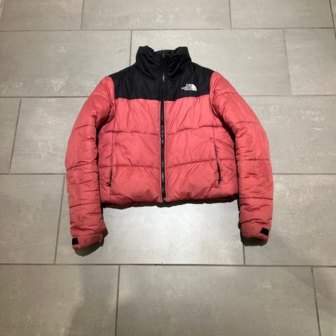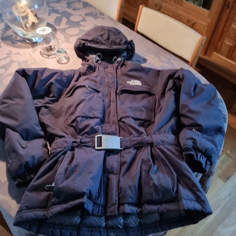 The North Face Vinterjakke i størrelse L til kvinder. Jakken er lyserød og lavet af dun, hvilket giver varme og isolering. Velegnet til kolde vejrforhold.