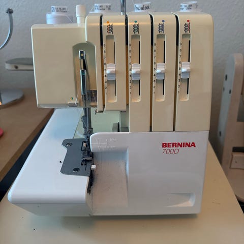 Symaskine 3000 kr., overlocker 1500 kr. og de store ruller sytråd og det lille brædt til venstre i billedet 200 kr.