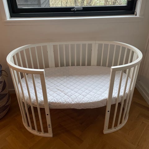 Stokke Sleepi Tremmeseng i hvid. Sengen er rund med tremmer og har hjul, hvilket gør den nem at flytte. Der medfølger madras + lagen. Brugt ganske få gange (under 10 gange). Ellers stået på børneværelset.