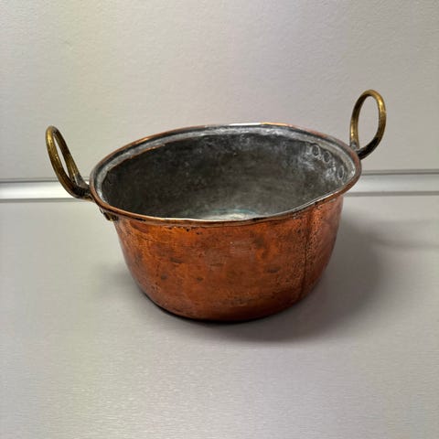 Sæt bestående af en kobbergryde med hank og et kobberfad med dekorativt mønster. Gryden har en rund form og indvendig belægning, fadet har en bølget kant og oval midte.