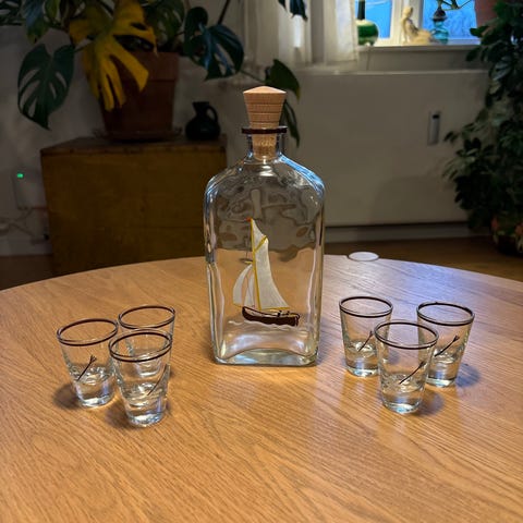 Karaffel højde med prop 22,5 cm, glas højde 5,7 cm