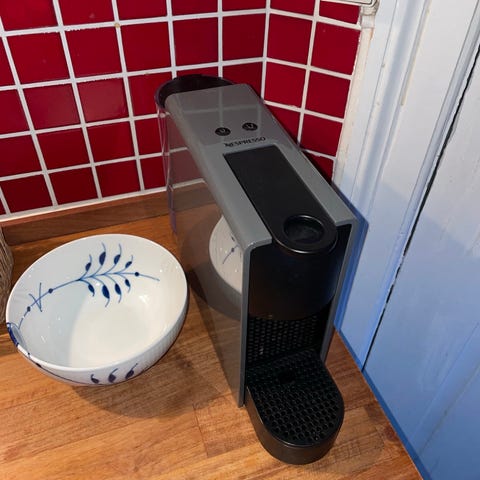Nespresso kaffemaskine i grå farve. Maskinen har et aftageligt vandreservoir og en kompakt størrelse, der passer til køkkenbordet. Designet til at brygge kaffe med Nespresso-kapsler.