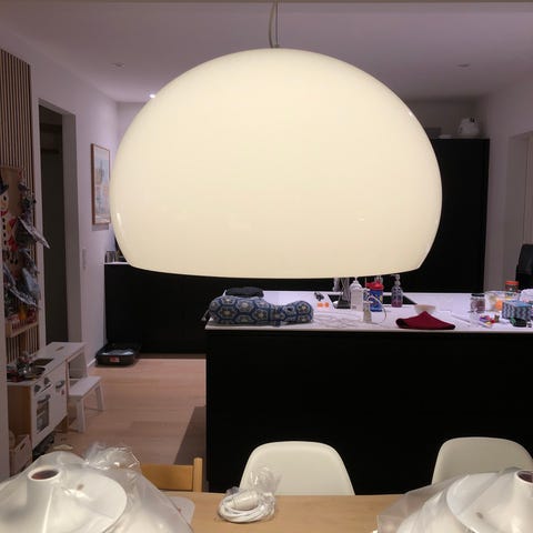 Kartell pendel, Orange. Alt efter hvilken pære der sættes i, kan lampen give meget lys, eller være mere dekorativ - se eks. billede 1. Fik stand.