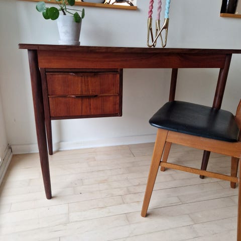 Lille skrivebord i teak i fin og velholdt stand med ganske få brugsspor. Bordpladen kan åbnes og bruges til en symaskine. Den har lige fået olie.