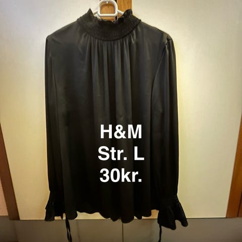 H&M bluse i blå farve med hvidt prikkemønster. Fremstillet i polyester materiale. Passer til kvinder i størrelse M. Blusen har 3/4 ærmer med flæsekant og rund hals med knaplukning bagpå.