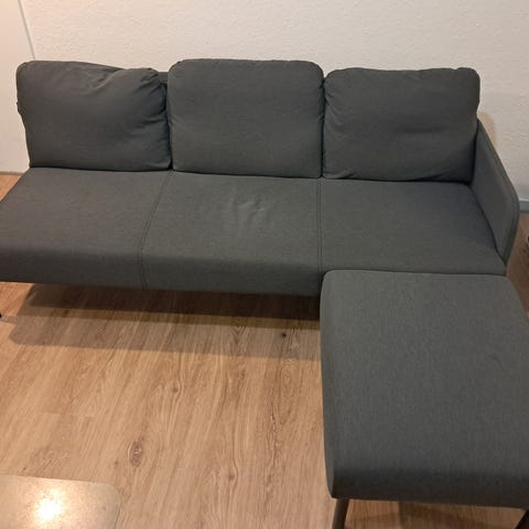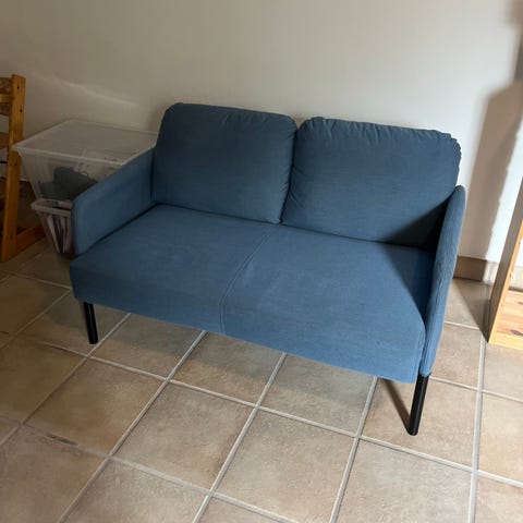 Glostad sofa fra Ikea med blåt stof - vare nr. 504.890.12 men som er grå til 899 kr - blå er vist udgået. se mål tegning på Ikeas side. Svarer først efter kl. 17.00 i hverdage.