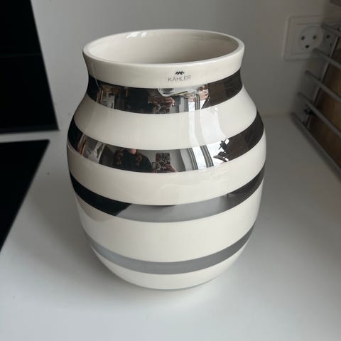 Kähler vase med sort-hvide horisontale striber. Fremstillet i keramik med glaseret overflade. Velegnet til dekoration og blomsterarrangementer.