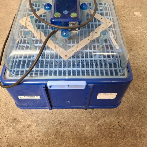 River ET ægklækker med grøn motor og rød bakke til æg. Udstyret med gennemsigtigt låg med ovale vinduer. Designet til at klække og inkubere æg med flere rækker til placering af æg.