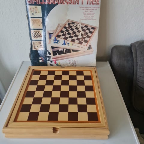 Spil plader i træ, i flot praktisk trækasse. Måler 35x35 cm.