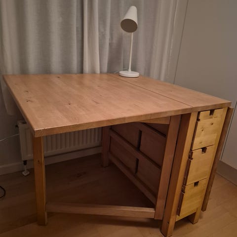Sælger et IKEA NORDEN klapbord i god stand. Bordet har to klapper, så det nemt kan tilpasses efter behov – perfekt til mindre boliger, køkken eller spisestue. Når klapperne er slået ned, fylder det meget lidt.